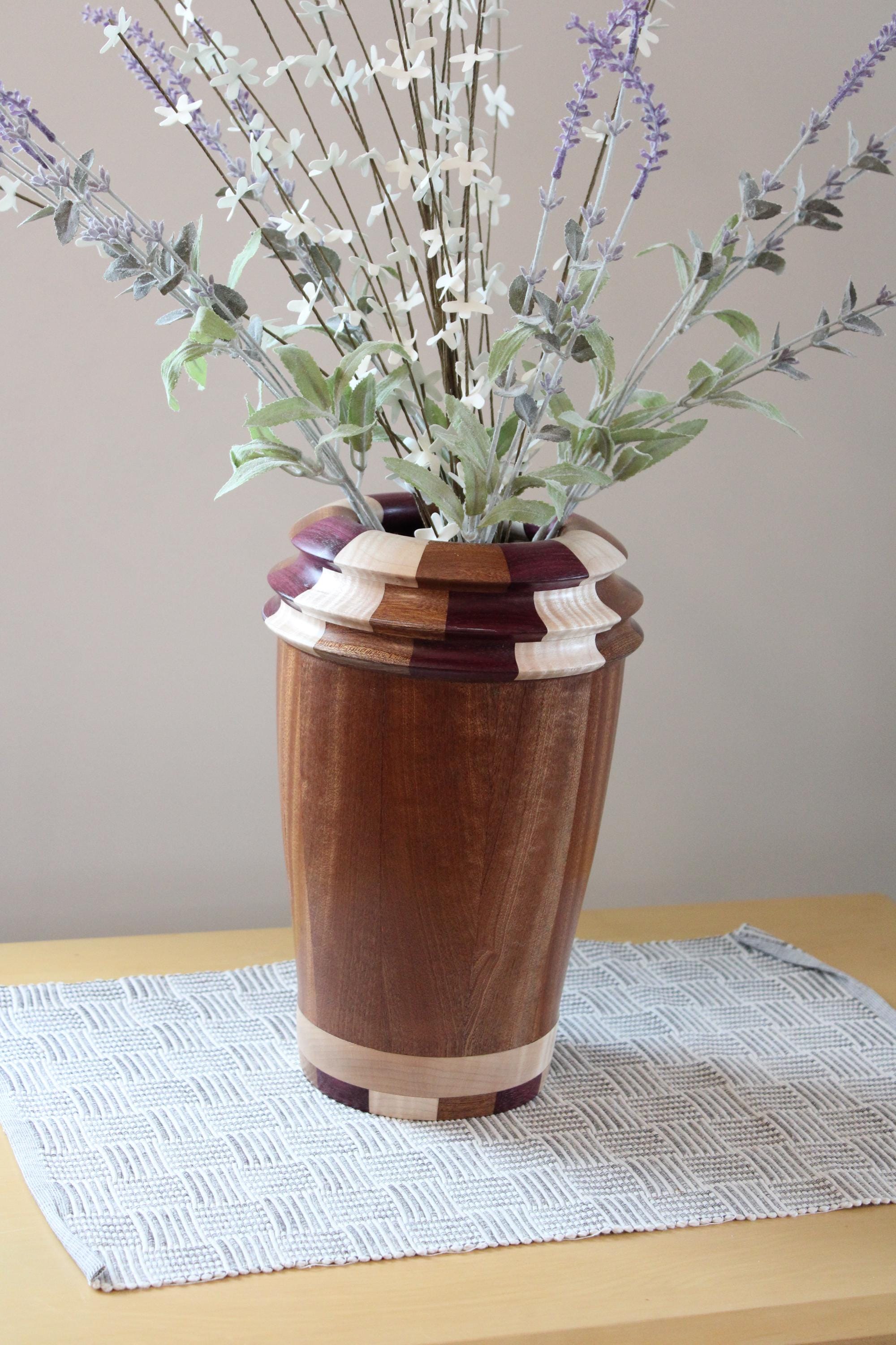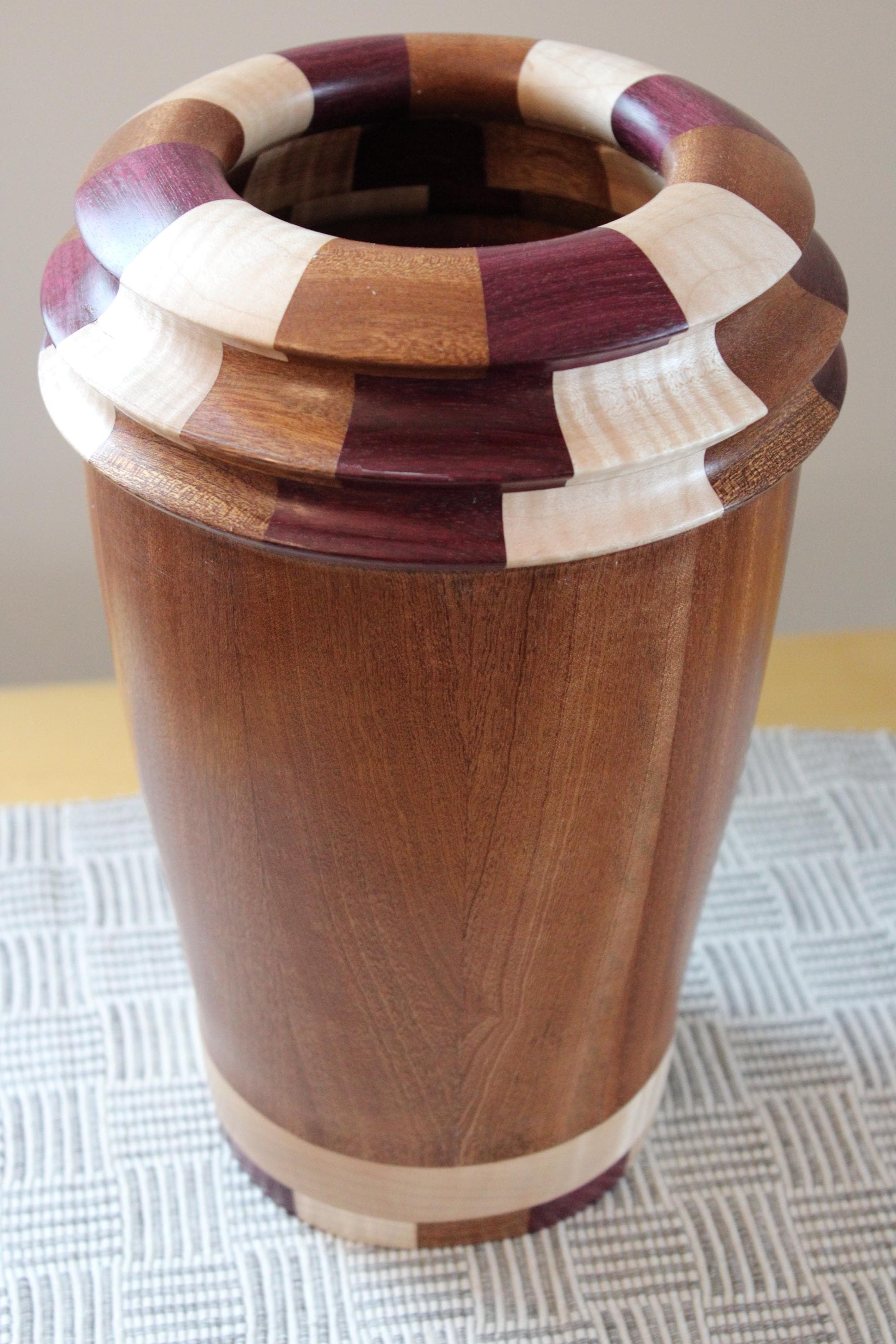 Vase made of Sapele (main body) with segment rings made of Purple Heart, Curly Maple and Sapele.