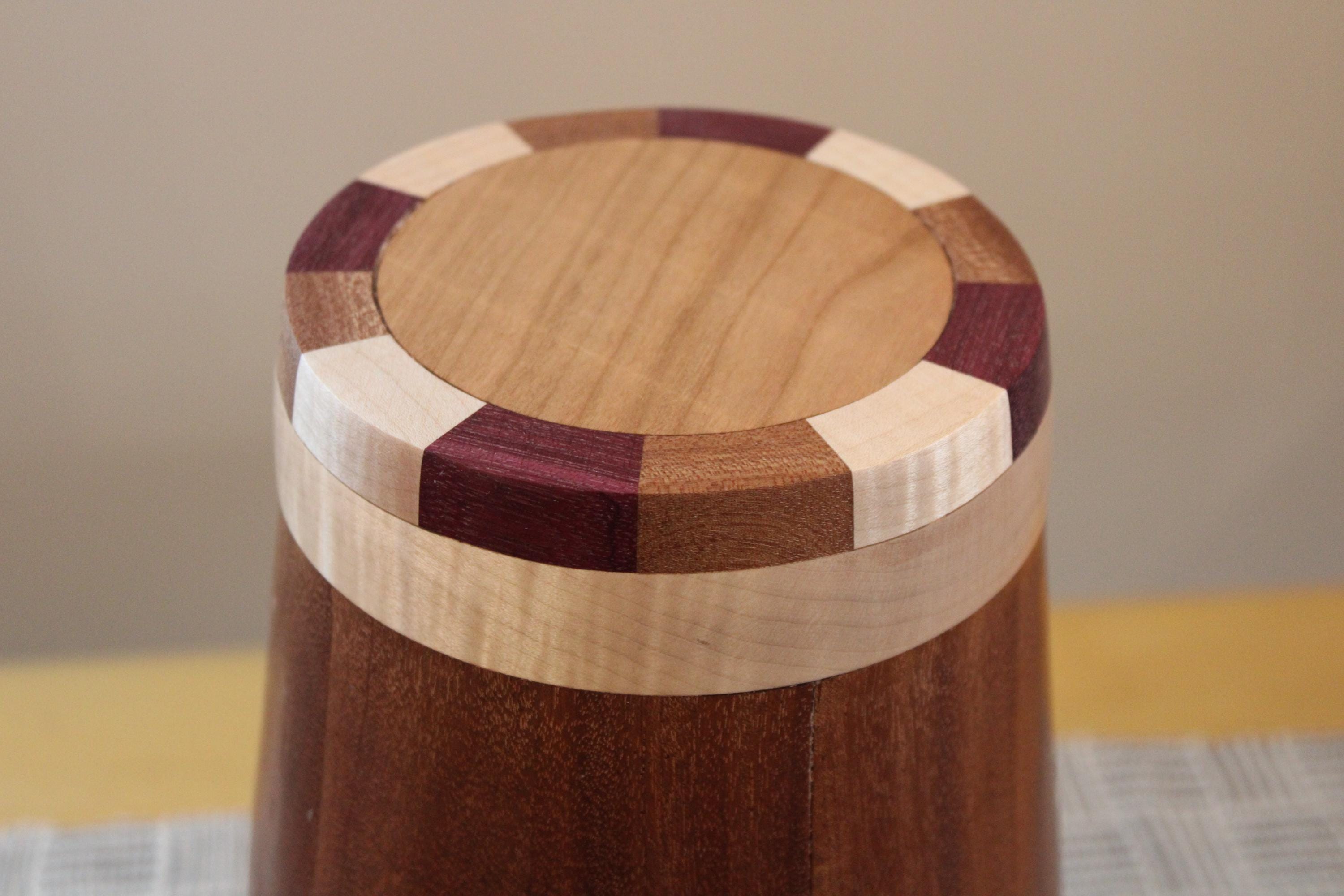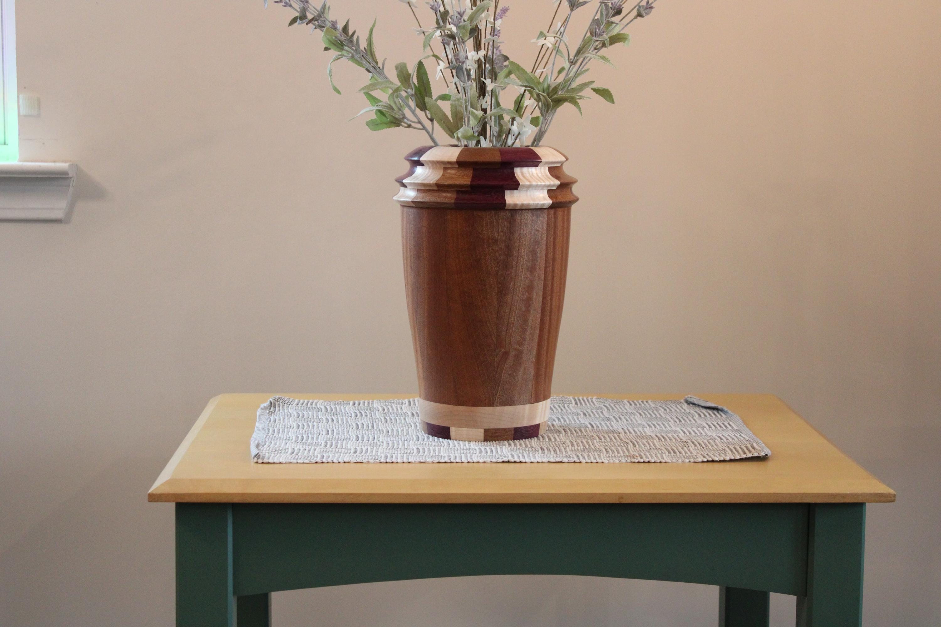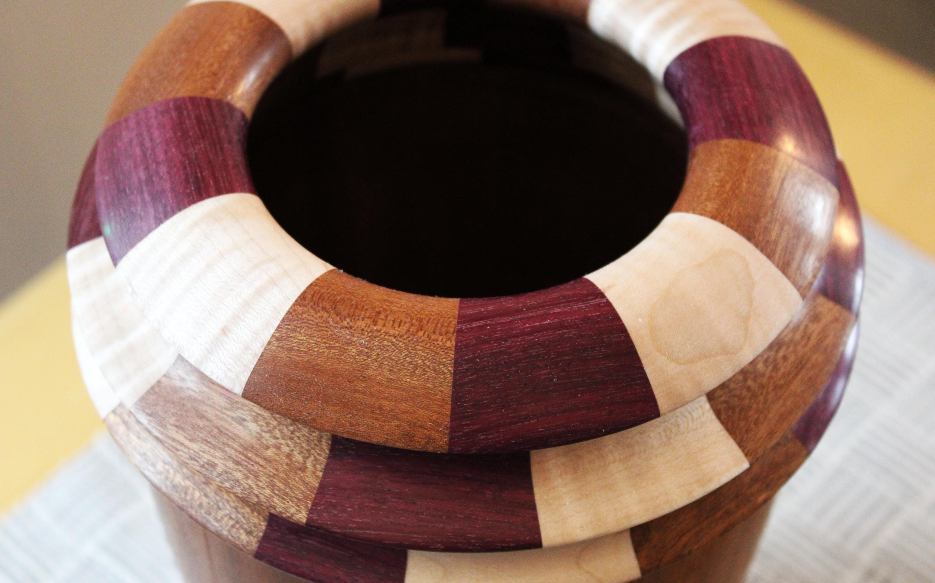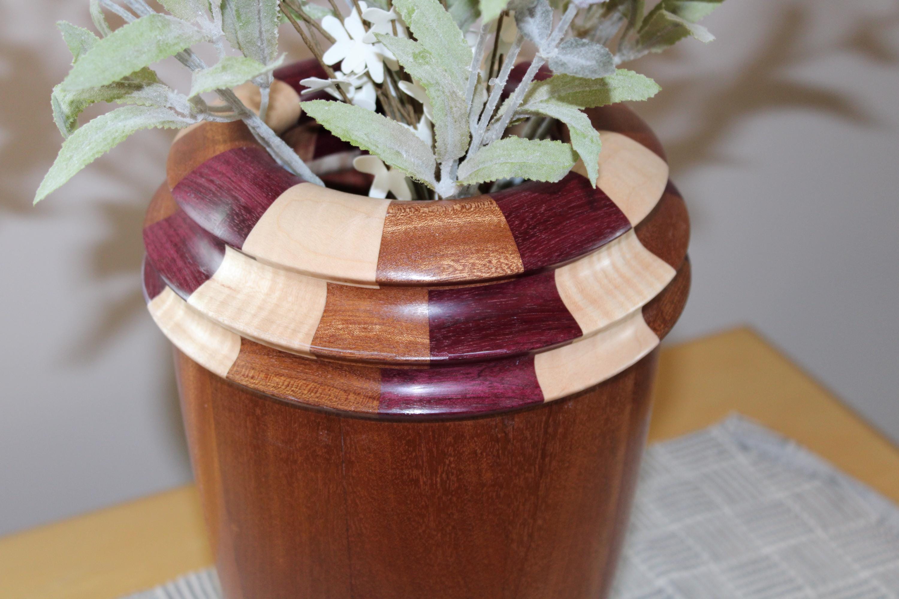 Beautiful and Unique lathe turned vase. The main body hard wood is Sapele (stave construction) with segment rings made of purple heart, curly maple and sapele. This vase is one of kind and stands out in any room. Finished with Yorkshire Grit (natural wood turners' abrasive paste), one of my favorite methods to accent the natural beauty in any hardwood.
