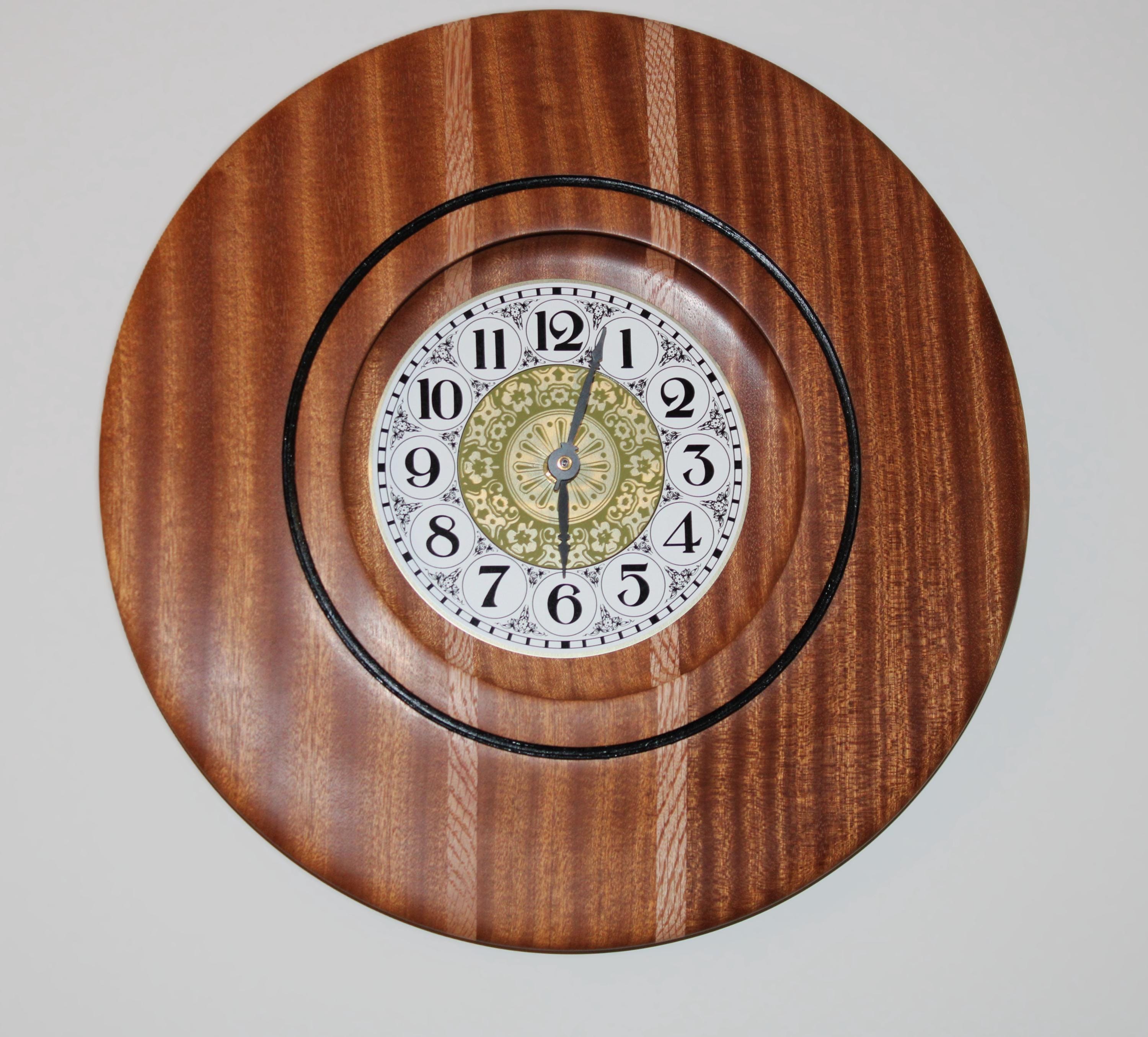 Unique, thick, hardwood Wall Clock made from Sapele with Red Oak stripes. This clock is stunning all by itself on a living room wall, and in addition, accents all surroundings. These hardwoods were turned on a wood lathe with the design of a "shadow box" effect. The clock parts "high end" and are battery operated with a single AA.