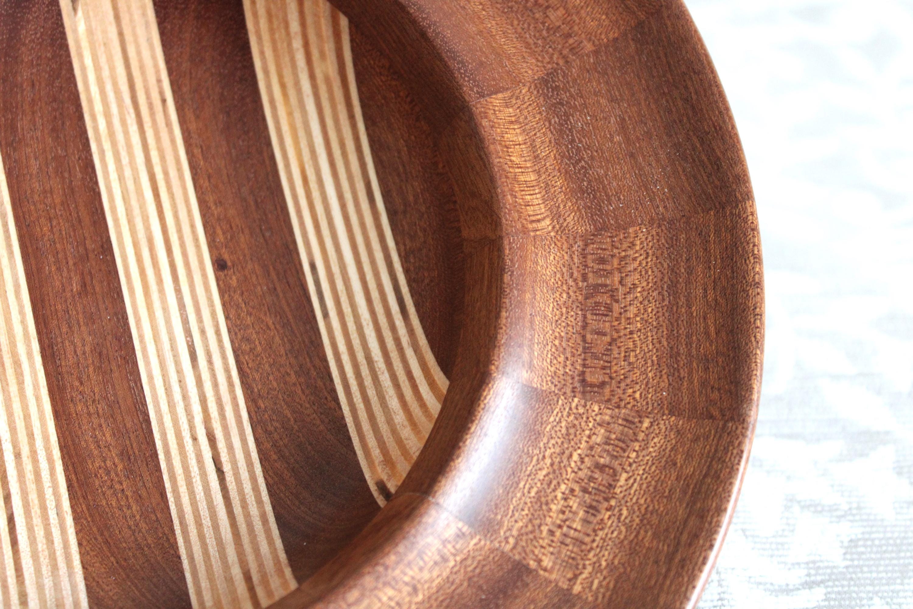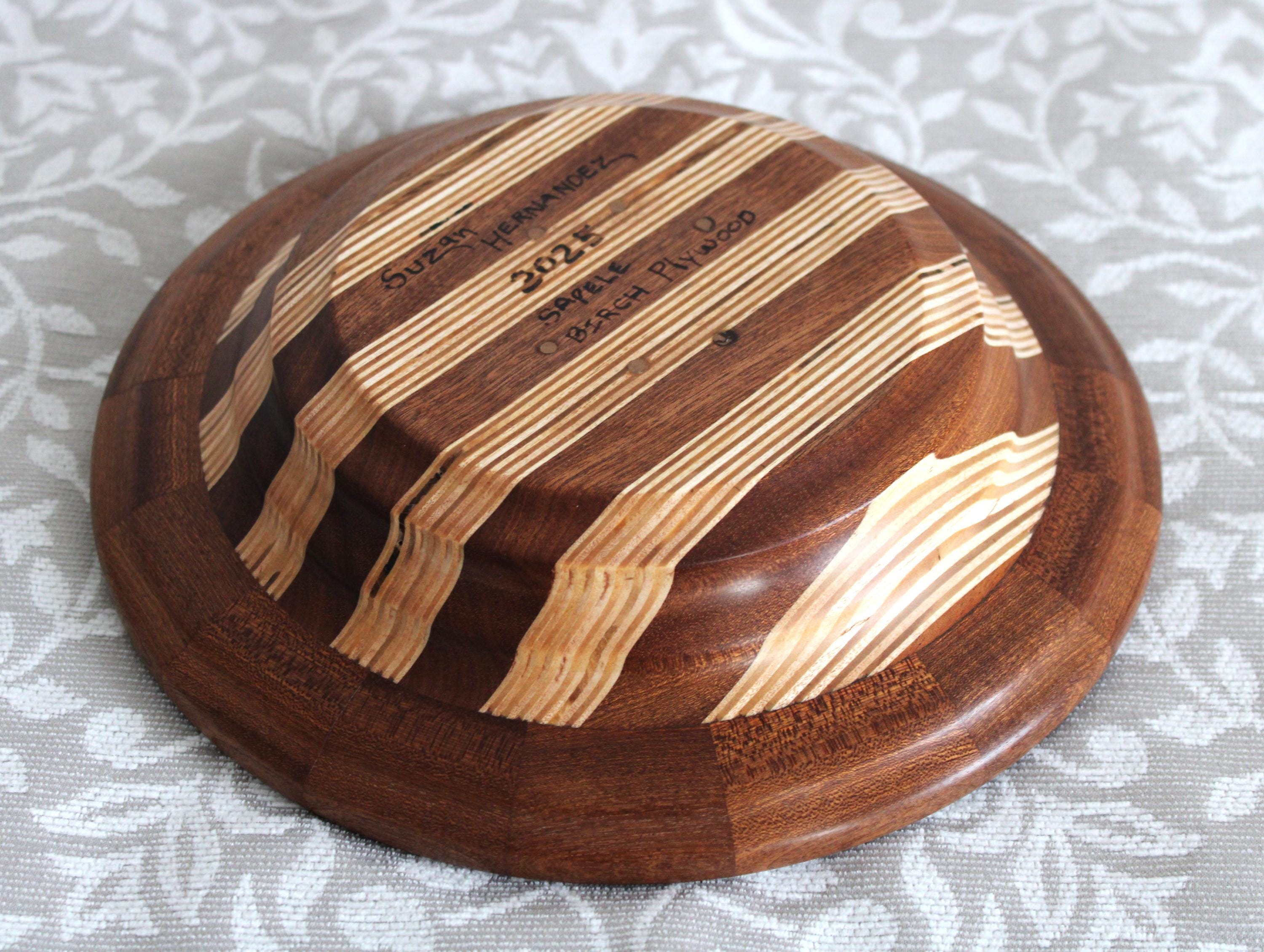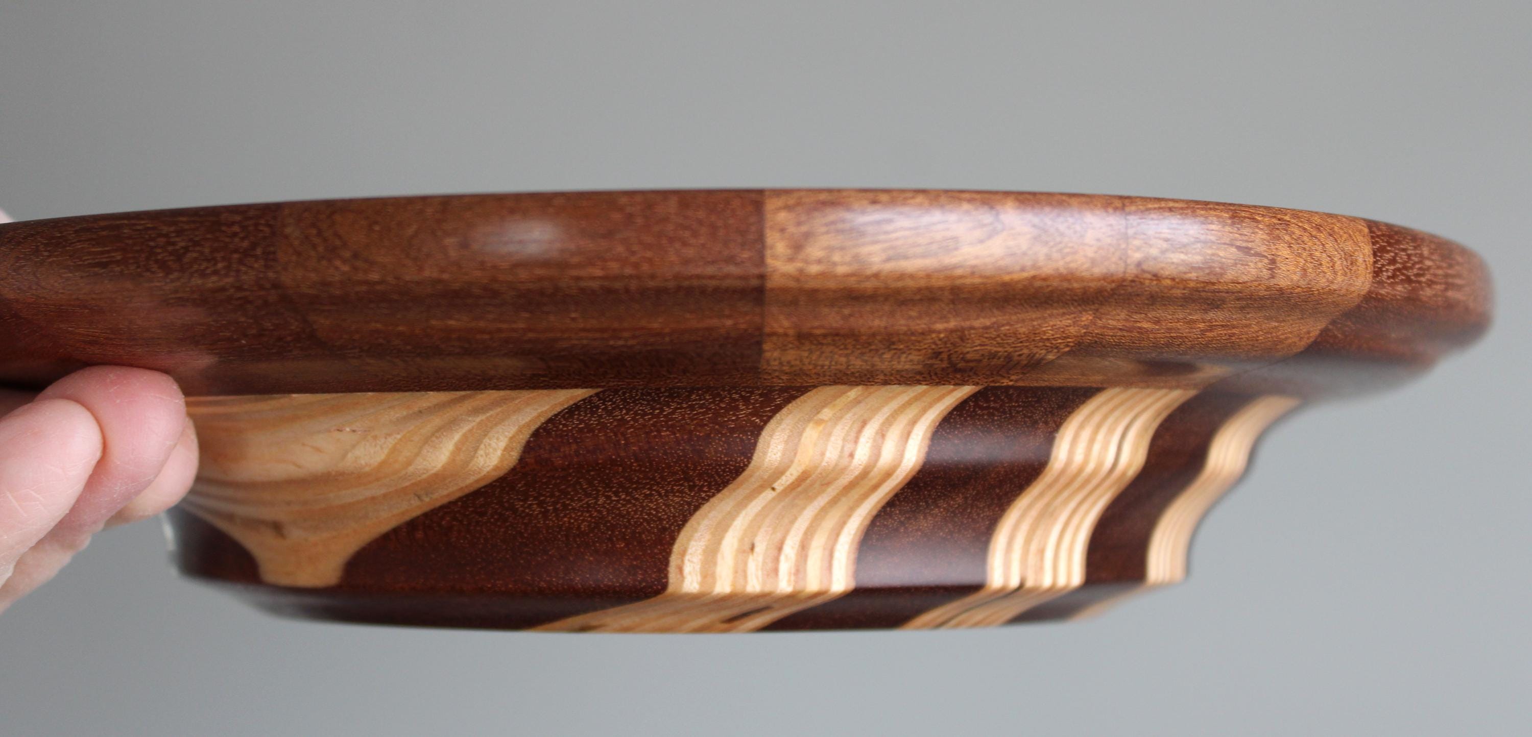 Multiple layers and segments of birch and sapele crafted this bowl. The bottom half was laminated with sapele and birch plywood, while the top sapele segment ring was made separately: ultimately,