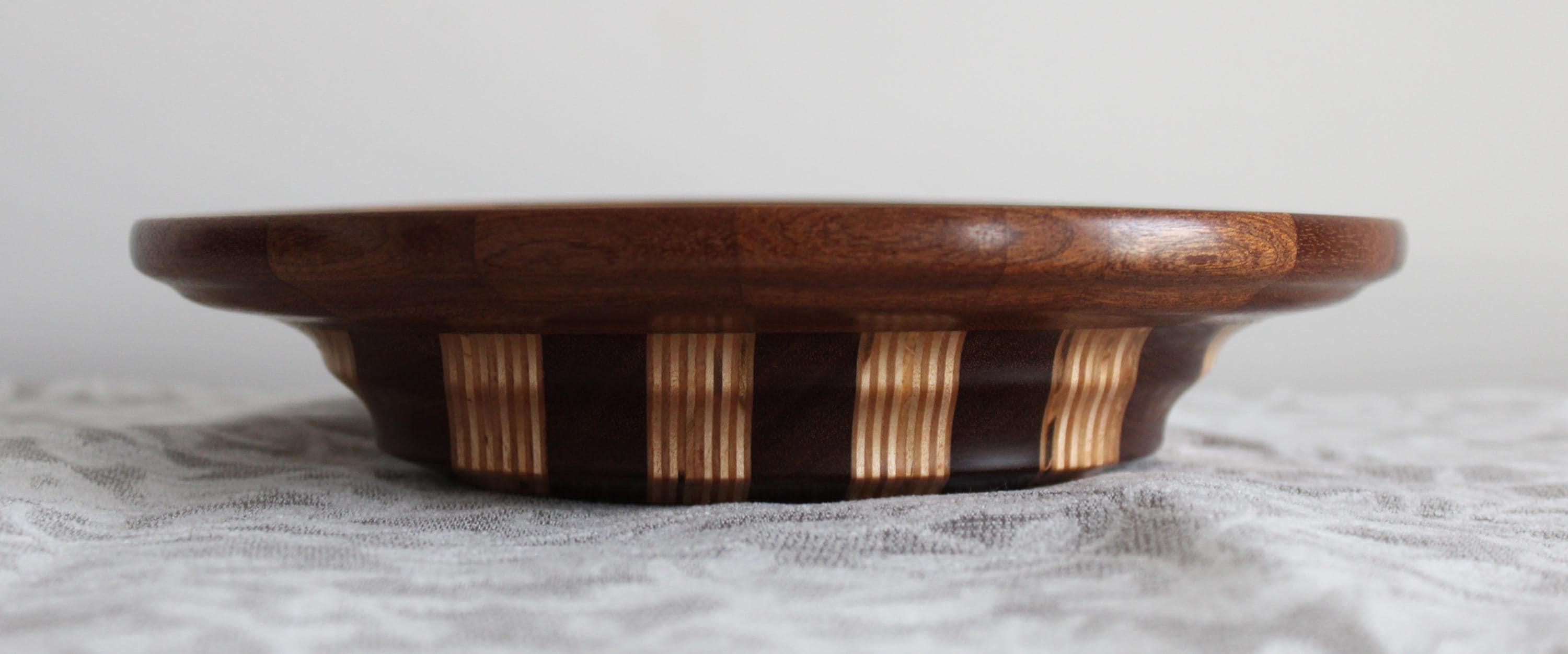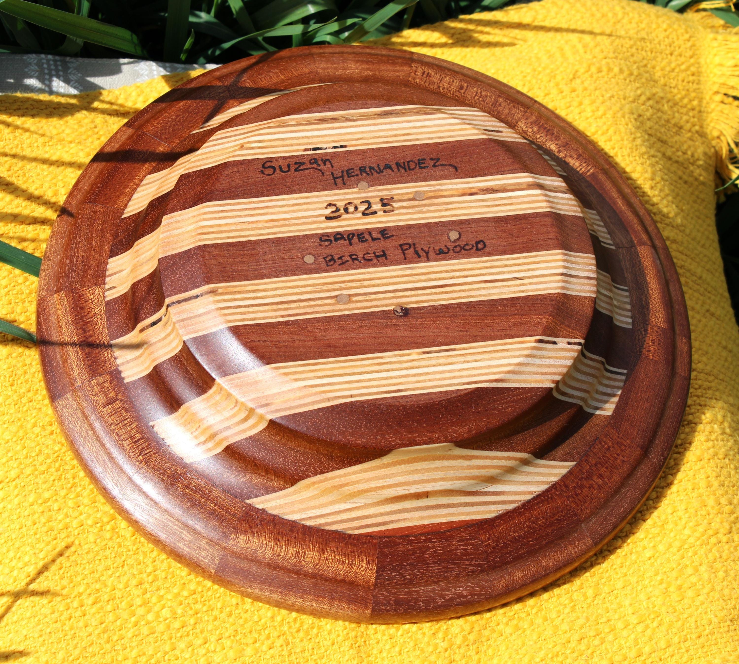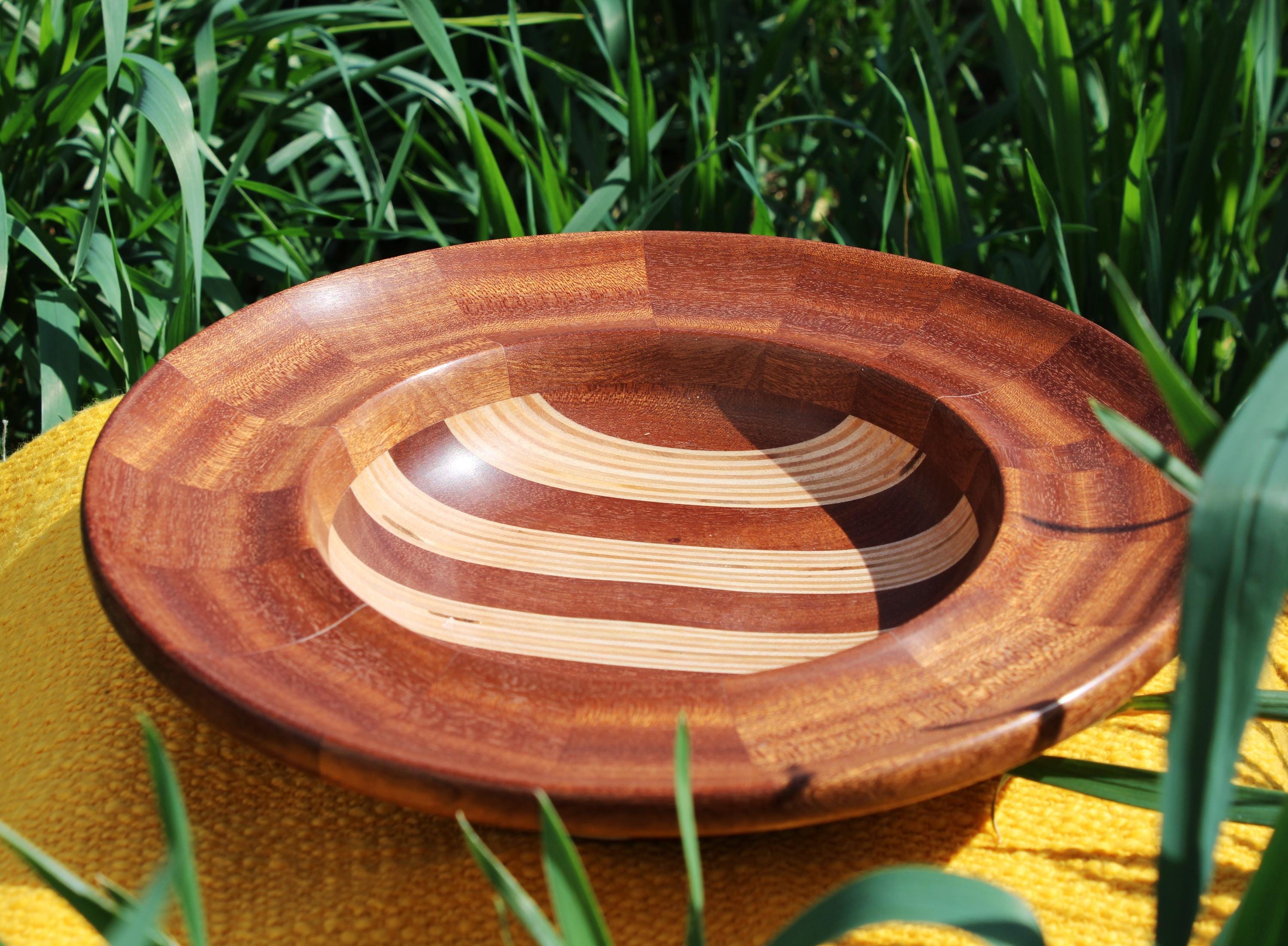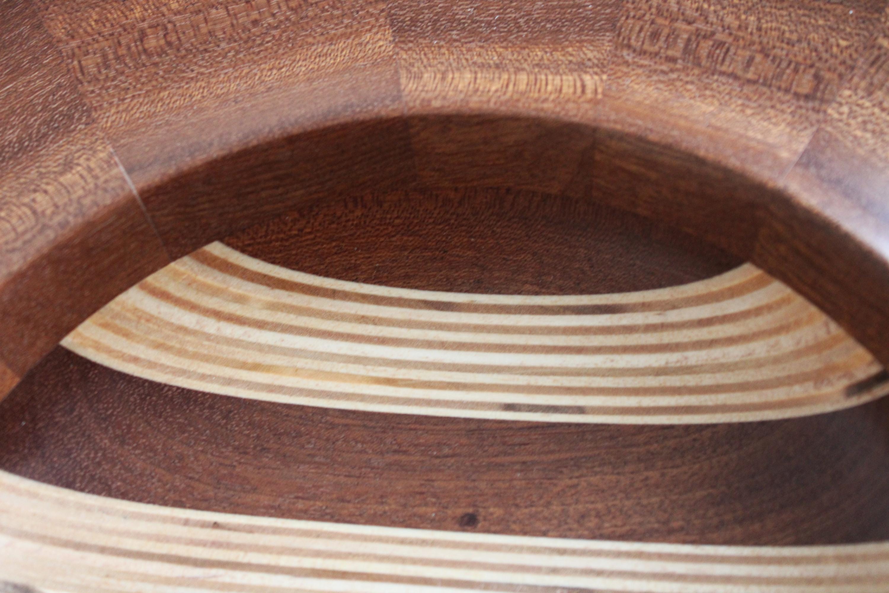Multiple layers and segments of birch and sapele crafted this bowl. The bottom half was laminated with sapele and birch plywood, while the top sapele segment ring was made separately: ultimately,